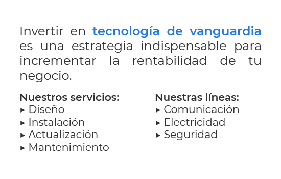 Somos una empresa orgullosamente mexicana, con 30 años de experiencia en comunicaciones y participación en el noroeste y occidente de la República Mexicana. Nos dedicamos al diseño, instalación, actualización y mantenimiento, de infraestructura eléctrica y proyectos vanguardistas de inversión tecnológica en sistemas para la eficaz transmisión de voz y datos, televisión y audio, a través de redes de fibra óptica y cobre; el ahorro en el consumo eléctrico por la automatización de aire acondicionado e iluminación, la integración de energía solar y el uso de luminarias de bajo consumo; así como la seguridad ante incendios e intrusos mediante sensores de detección, videovigilancia y control de acceso.
